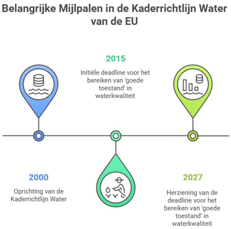 Het is belangrijk te realiseren dat het tijdstip van de vergunningsaanvraag niet bepalend is voor de eisen die worden gesteld. De KRW uit 2000 vormt de basis voor de strengere lozingsnormen. Of u nu in 2025 of in 2027 een vergunning aanvraagt, de KRW-doelstellingen zijn leidend.